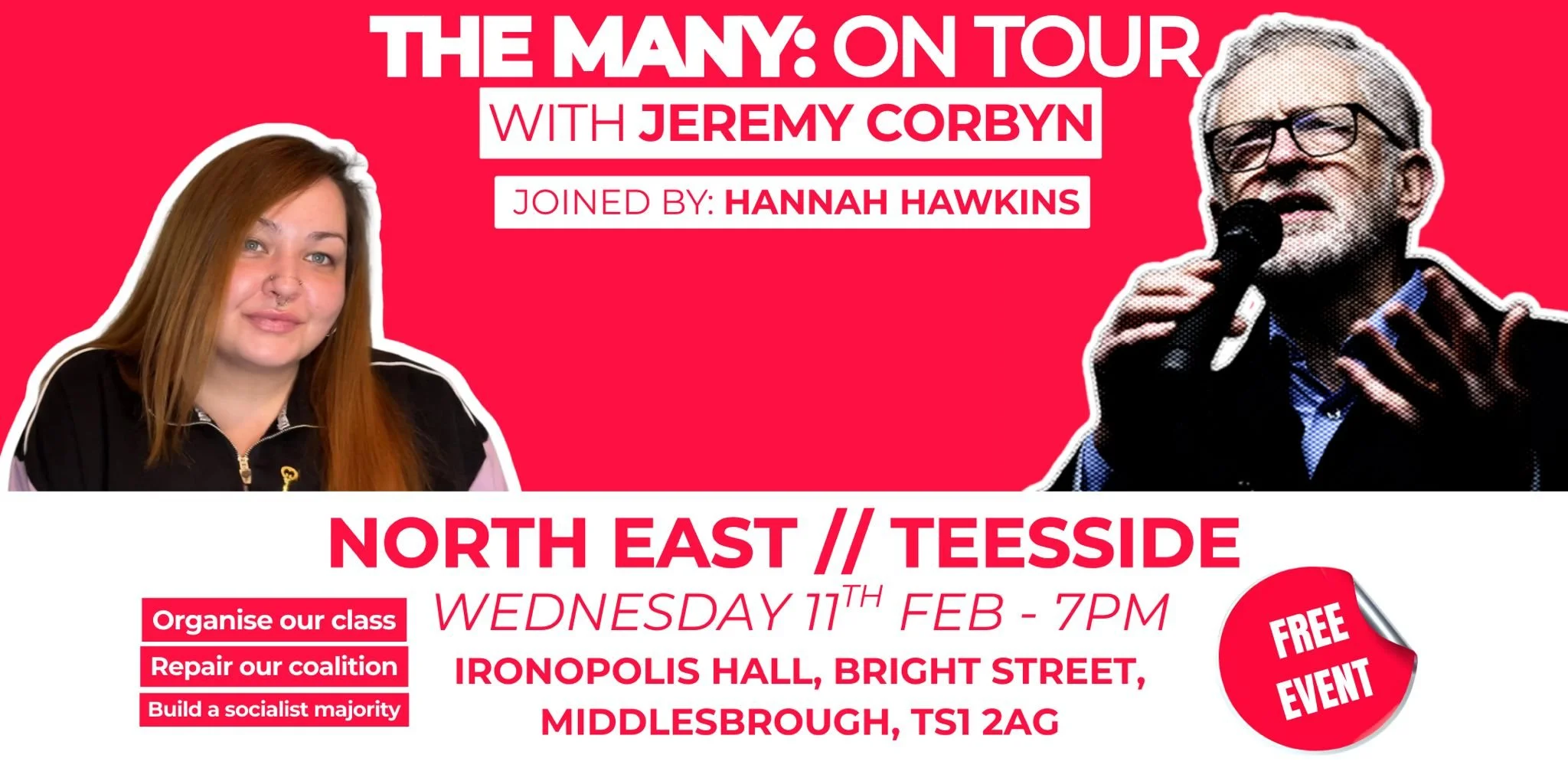 Join Jeremy Corbyn and The Many’s candidate for the North East region, Hannah Hawkins in Middlesbrough this Wednesday 11th of February.